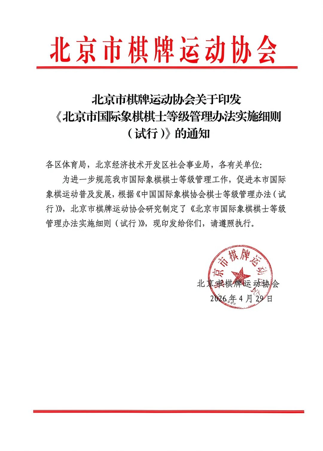 北京市棋牌运动协会关于印发《北京市国际象棋棋士等级管理办法实施细则(试行)》的通知